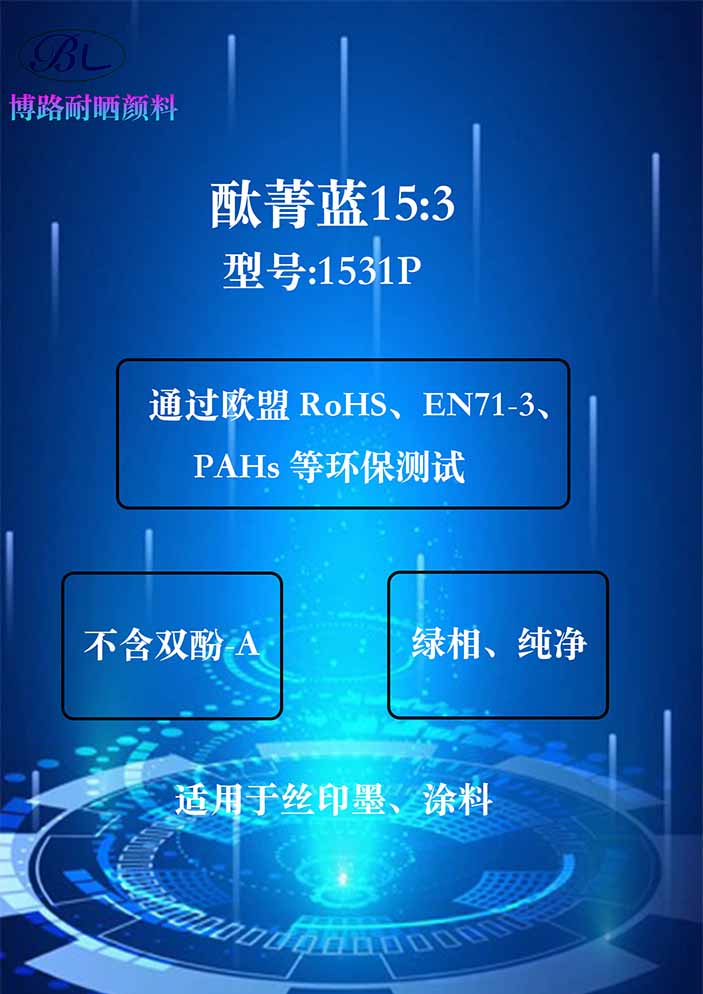 酞菁蓝具有纯净的绿光蓝色相。有良好的耐晒性,良好的耐酸碱性,通用型很强,广泛用于涂料, 油漆,各种油墨如柔印水墨,胶印墨和塑胶等。